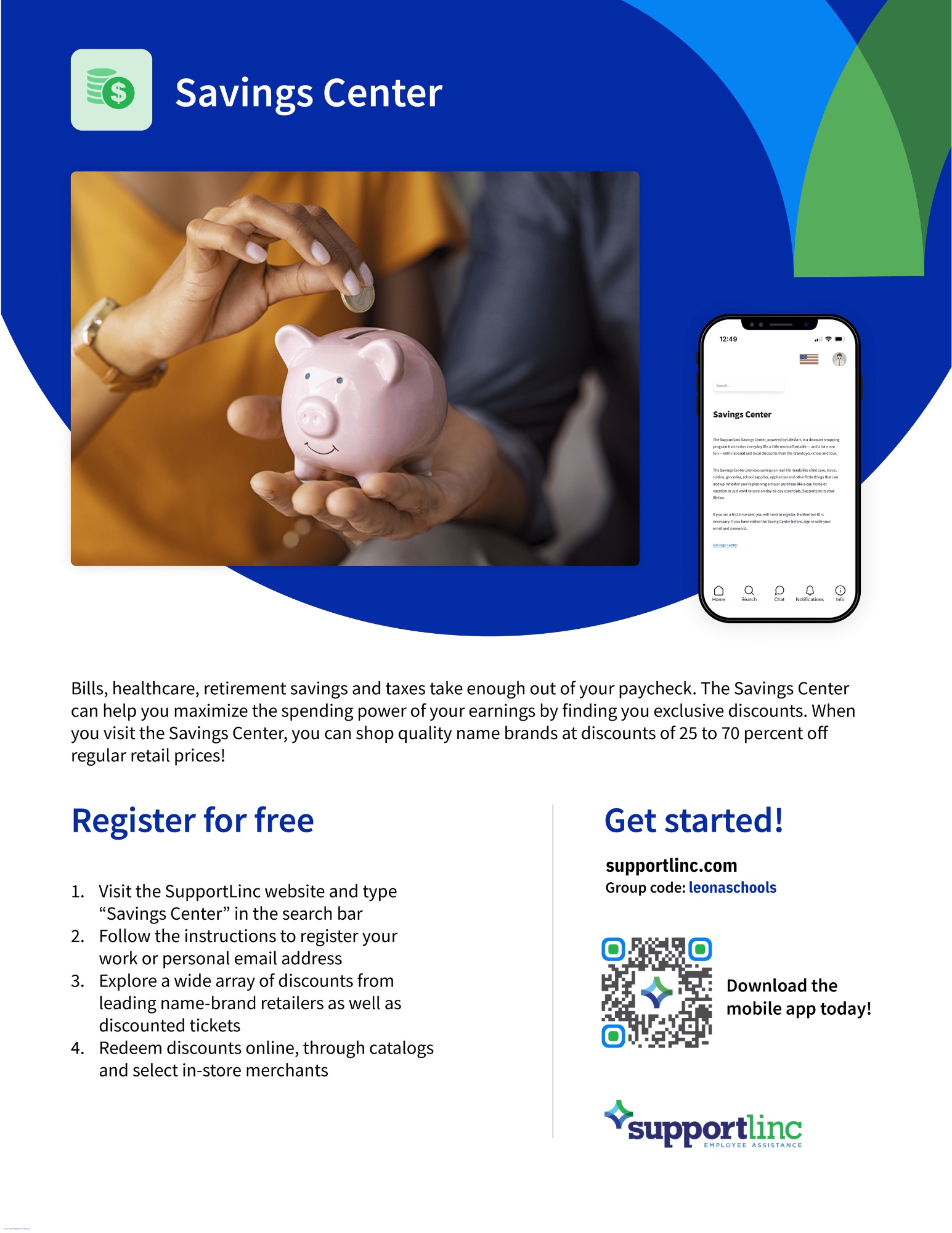 The Employee Assistance Program (EAP) provides access to the Savings Center, offering discounts on tax prep, travel, hotels, tickets, electronics, food, and more. To explore available deals, visit SupportLinc and use the code leonaschools. New users will need to create an account before logging in. Check out the flyer for more details!